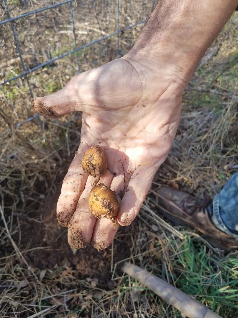 We finished our visit by digging ground nuts (Apios americana). This is a delicious tuber of substantial caloric content: a rarity among our non-nut wild foods. Cook and eat like potatoes! We dug up lots of them with ease in the moist soil along the edge of Jeff's garden. "Apios!" He cried as he pulled them from the Earth. We laughed and he filled a black plastic planting pot with them for me and I headed on home. A lovely day with a dear multitalented friend. I love when wild foods, primitive skills, friends and magical homesteads all blend into a super sweet day.