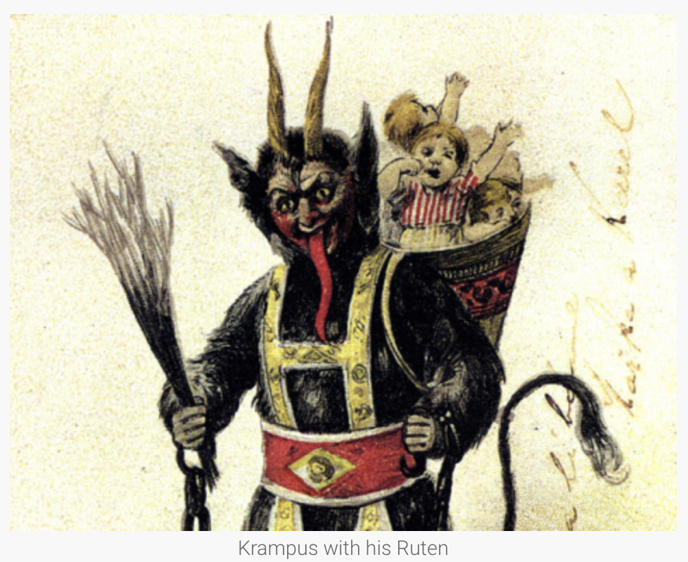 "Small gold-painted birch bundles are often presented by Krampus to each family. The birches are hung on a wall as a form of decoration and seem to be renewed each year particularly in those houses where the behaviour of the children merits the application of corporal correction."